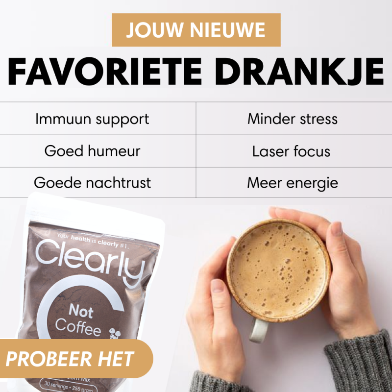 Not Coffee zorgt voor langdurige energie gedurende de dag zonder een cafeïnecrash. Het vermindert de afhankelijkheid van koffie, wat kan leiden tot energiedips. Clearly Not Coffee biedt een gebalanceerde aanpak voor energie, waardoor je gefocust en alert blijft zonder negatieve bijwerkingen.